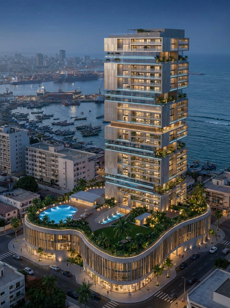 The Twin Towers site is located in the heart of Dakar's central business district, occupying a prime position on the Dakar peninsula with direct visual and physical access to the Atlantic coastline. The project commands panoramic views across the ocean, the Port of Dakar, Independence Square, the Grand Mosque and the Presidential Palace, all within walking distance. The site lies along the city's main commercial axis, placing it at the epicentre of Dakar's economic and civic life.